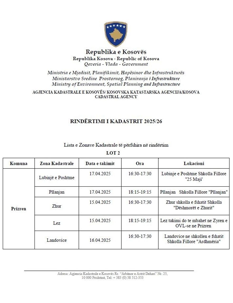 Komuna e Prizrenit ka njoftuar se Agjencia Kadastrale e Kosovës do të fillojë rindërtimin e Kadastrit në zonat Zhur, Lez, Landovicë, Lubinje e Poshtme dhe Pllanjanë.