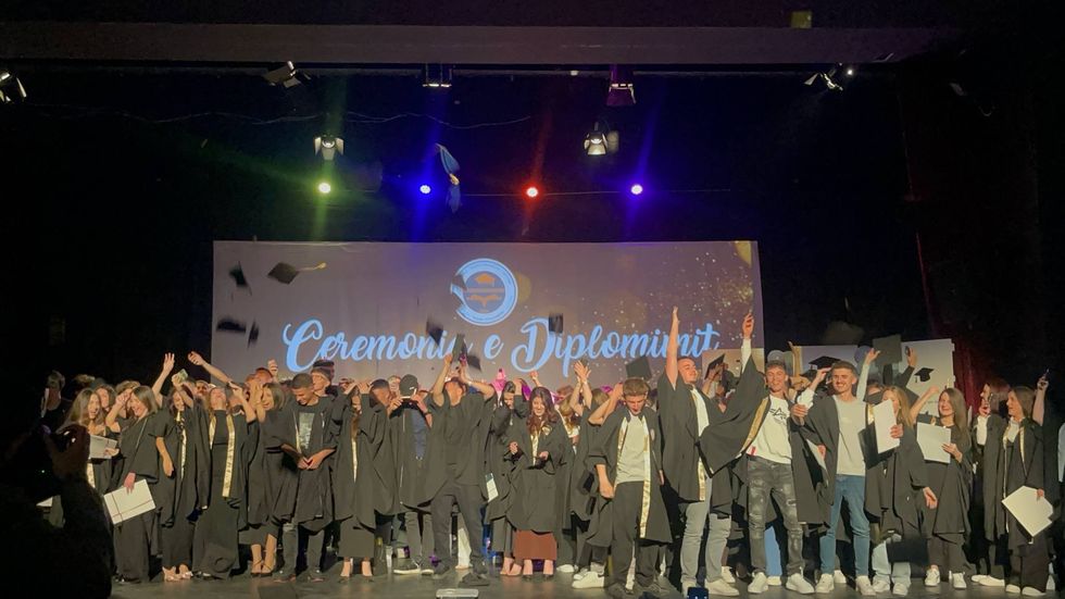 Në fund të ceremonisë, të gjithë maturantët hodhën kapelat si simbol i përfundimit të shkollës së mesme.