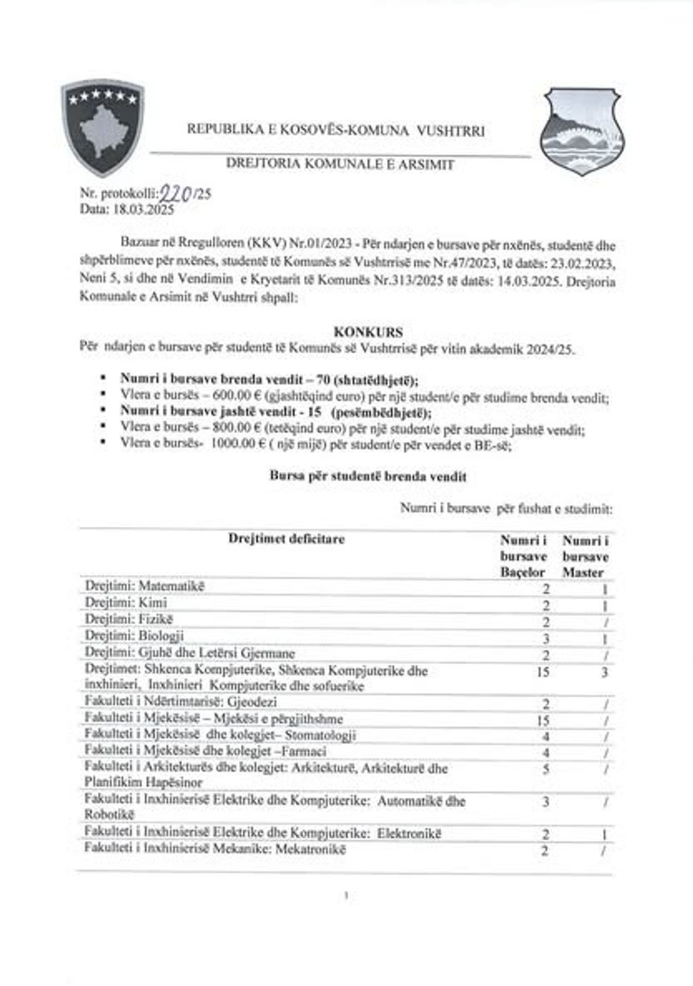 Komuna e Vushtrrisë hap konkurs për ndarjen e bursave për studentët