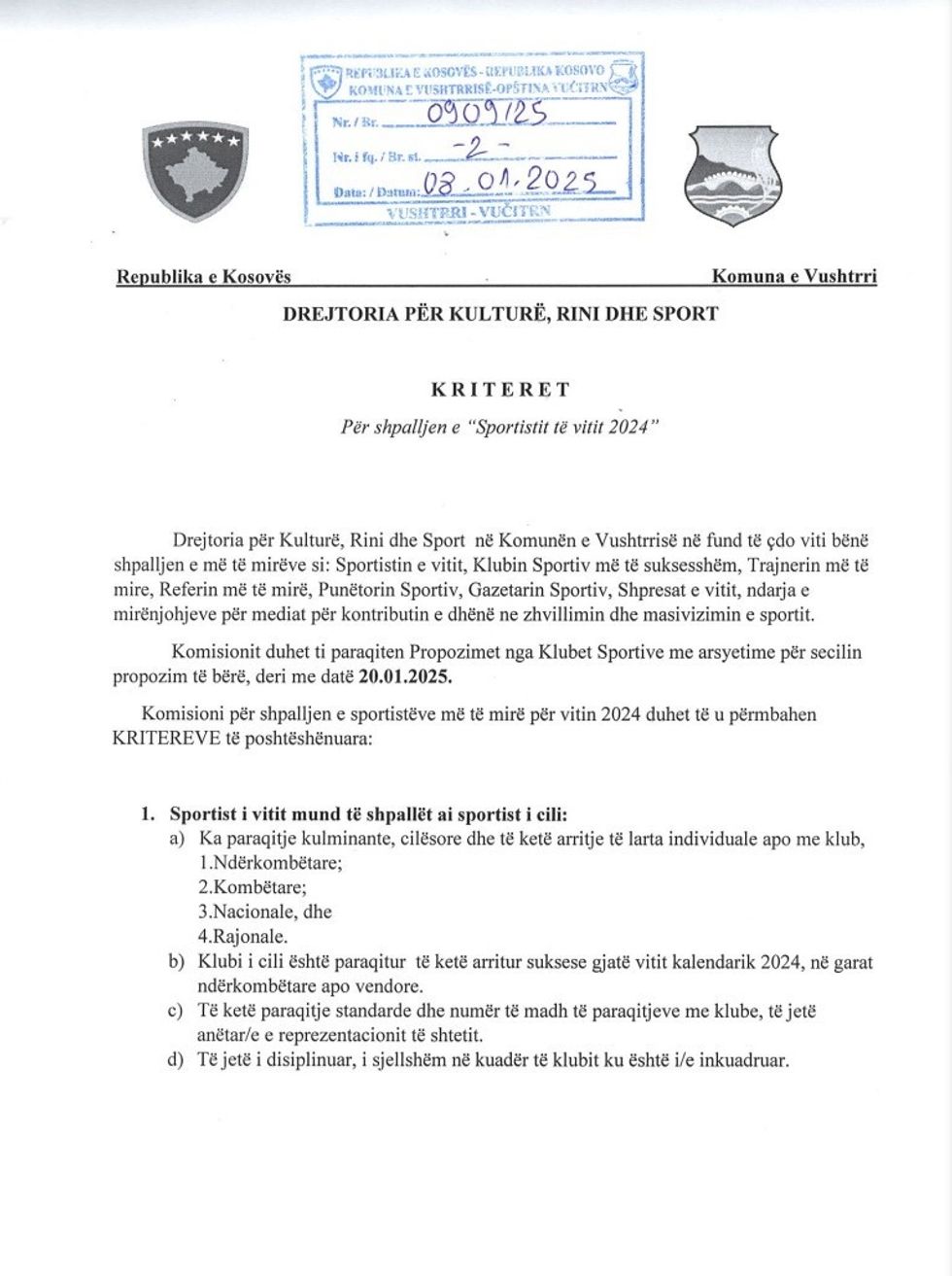 Bëhet e ditur se klubet sportive duhet t’i paraqesin propozimet tek komisioni deri më datën 20.01.2025.