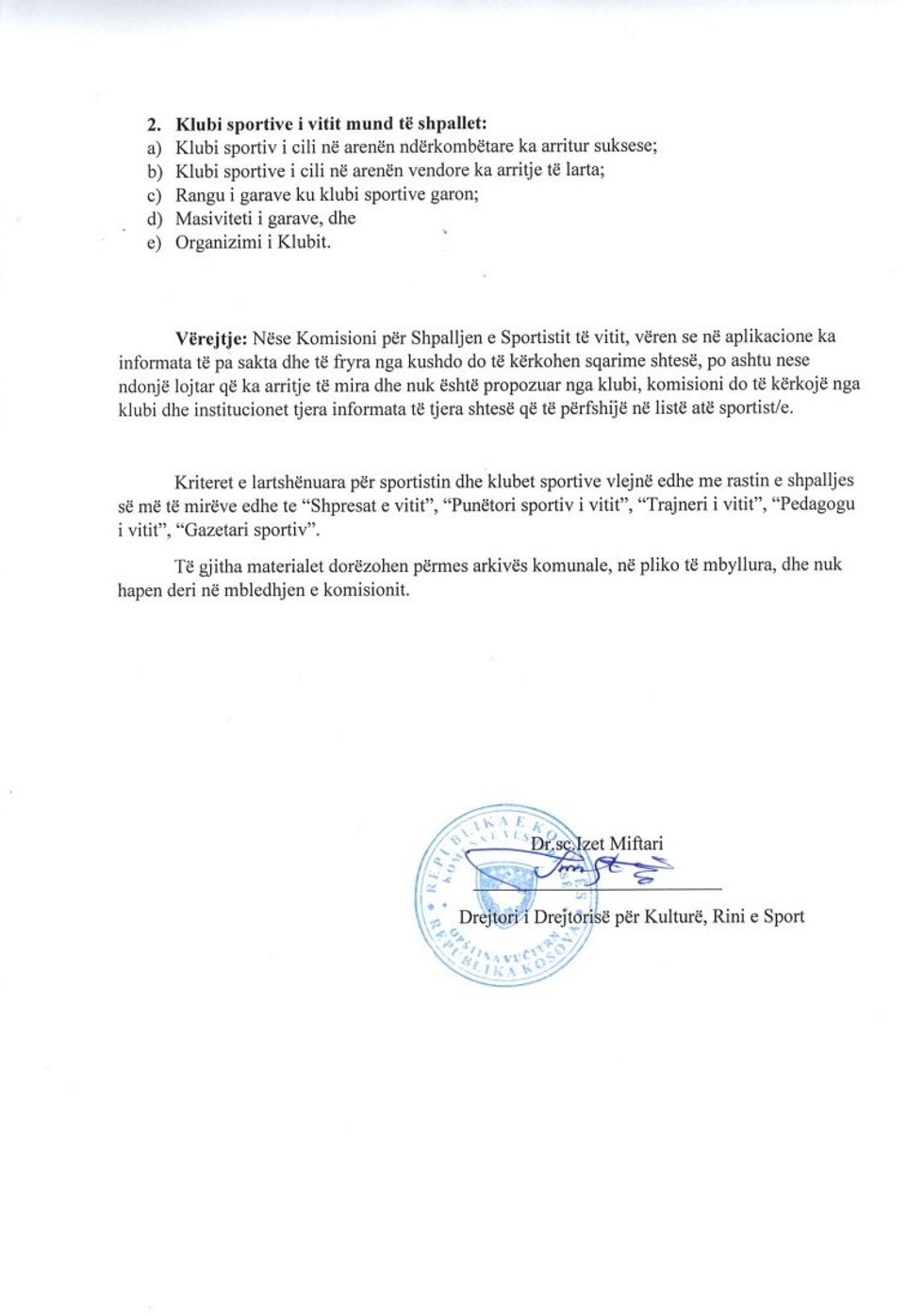 Sipas njoftimit, kjo shpallje është hapur edhe për “Klubi sportiv më i suksesshëm”, “Trajneri më i mirë”, “Referi më i mirë”, “Punëtori sportiv”, “Gazetari sportiv” dhe “Shpresat e vitit", shkruan Telegrafi.