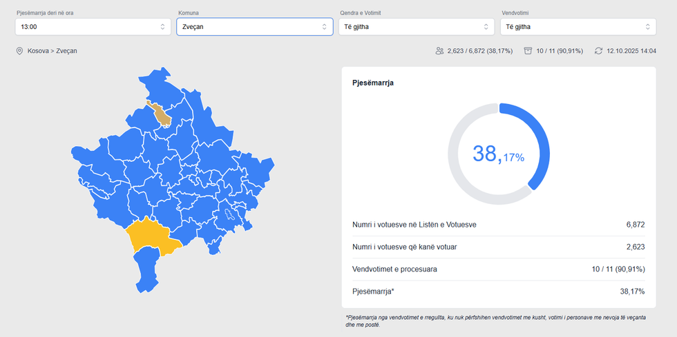 Po ashtu, edhe në Zveçan deri në ora 13:00 kanë votuar 2 mijë e 623 qytetarë, ndërsa të drejtë vote kanë 6 mijë e 872 qytetarë.
