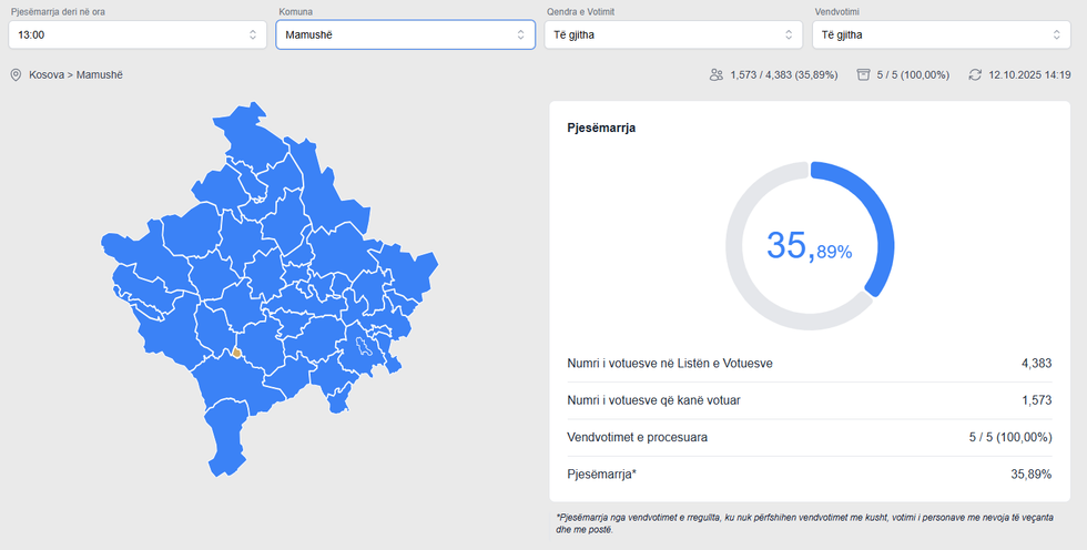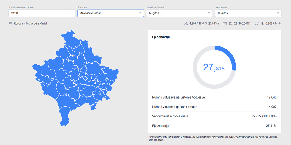 Sot, e diel, më 12 tetor 2025, qytetarët e Republikës së Kosovës po u drejtohen kutive të votimit për të zgjedhur kryetarët e komunave dhe anëtarët e kuvendeve komunale në kuadër të zgjedhjeve lokale.