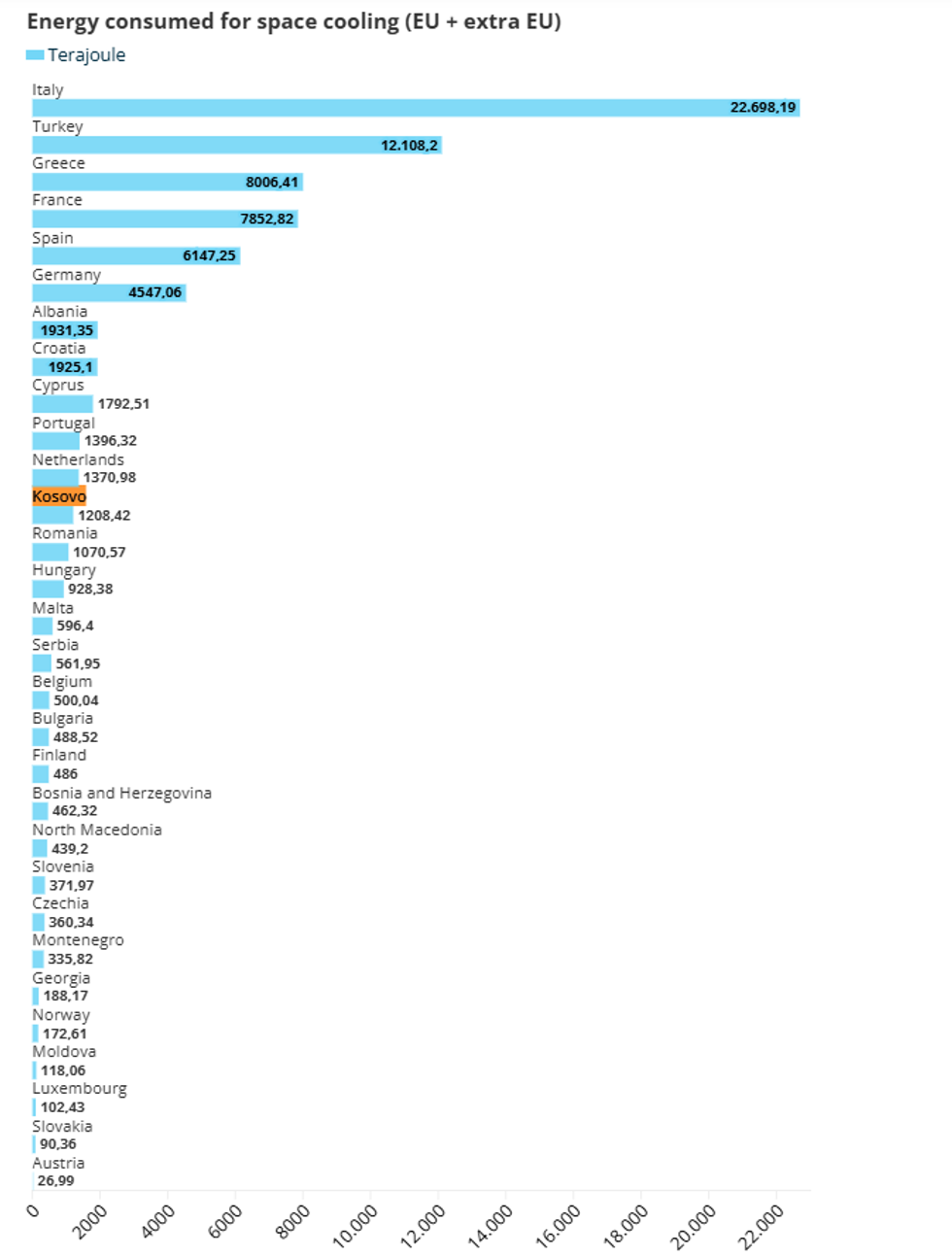 Ndërkohë, Kosova renditet në pozitën e 12-të në listën e vendeve me konsum më të lartë të energjisë për ftohjen e hapësirave. Sipas të dhënave më të fundit, vendi ynë shpenzon rreth 1208.42 teraxhul energji për këtë qëllim, ndërsa Shqipëria zë vendin e shtatë me 1931.35 teraxhul.
