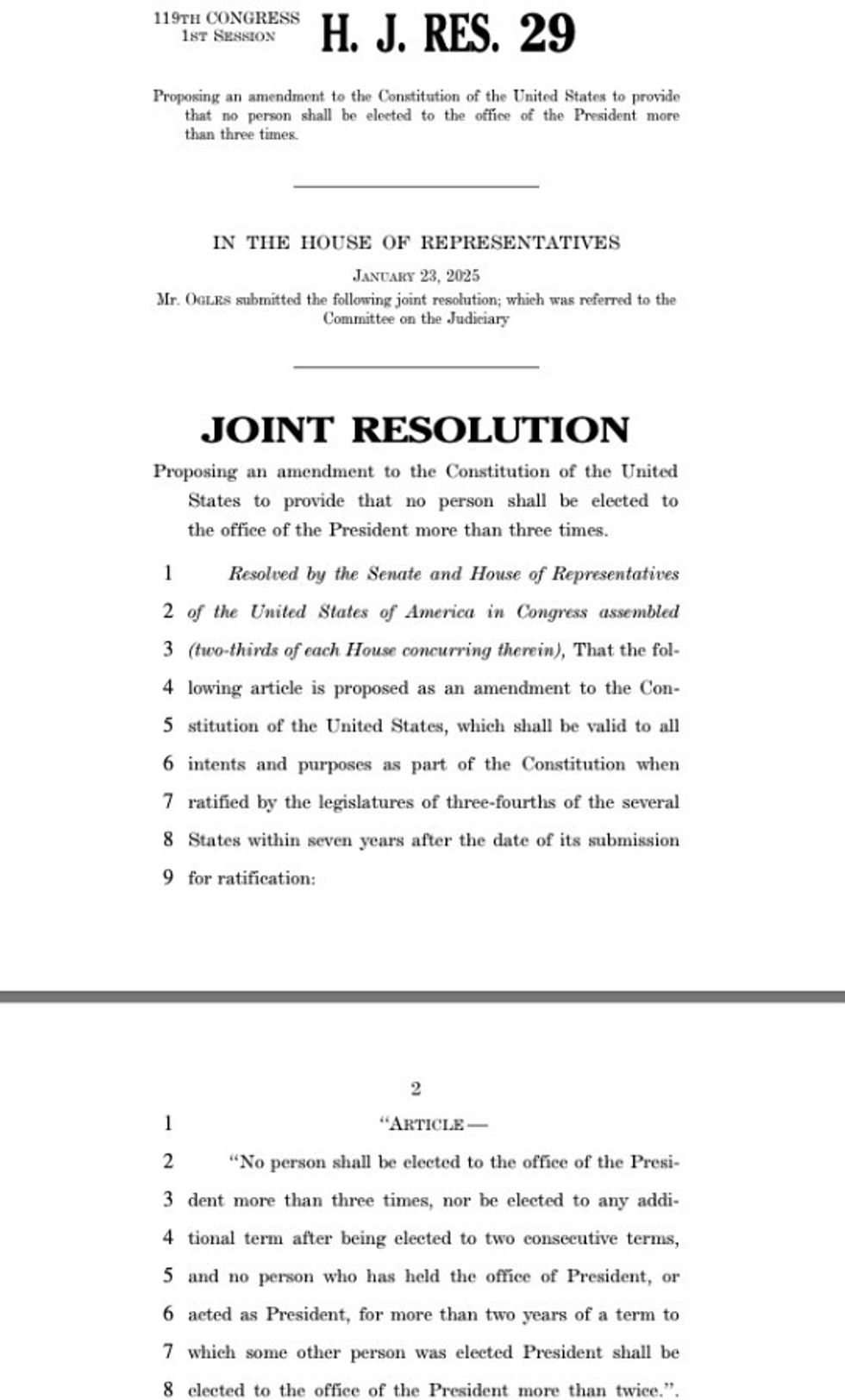 Ky propozim është bërë nga Andy Ogles, një republikan nga Tennessee, i cili ka paraqitur një rezolutë të veçantë që kërkon ndryshimin e Amendamentit të 22-të të Kushtetutës.
