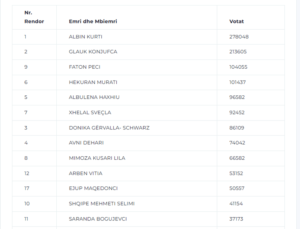 Ndër ministrat më të votuar janë edhe Albulena Haxhiu me 96 mijë e 582 vota, pastaj ministri Xhelal Sveçla me 92 mijë e 452 vota, e po ashtu edhe ministrja Donika Gërvalla me 86 mijë e 109 vota.