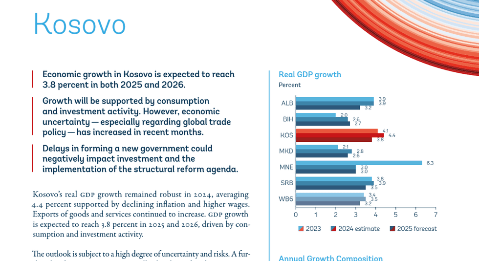 Banka Botërore parashikon se norma e përbashkët e rritjes ekonomike e Shqipërisë, Bosnje dhe Hercegovinës, Kosovës, Malit të Zi, Maqedonisë së Veriut dhe Serbisë, do të arrijë në 3.2% në vitin 2025, që paraqet një ndryshim me 0.5 pikë përqindje më pak nga parashikimi i mëparshëm. Rritja ekonomike parashikohet të përshpejtohet në 3.5% në vitin 2026.