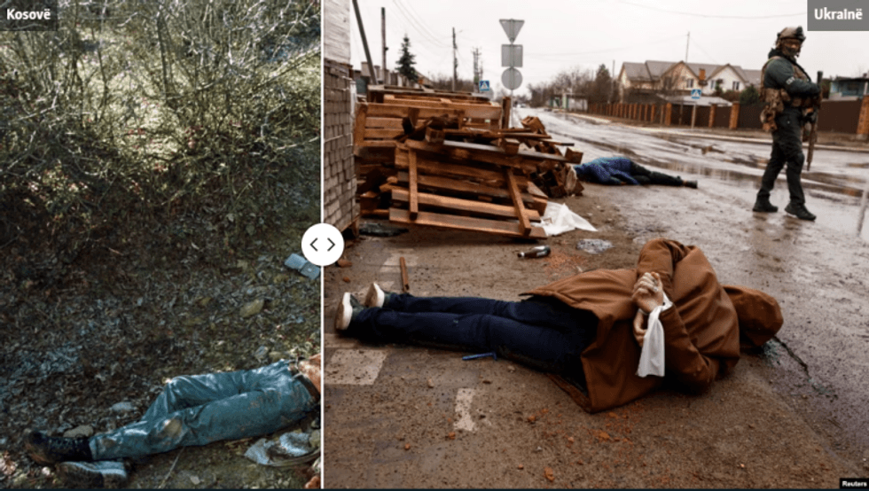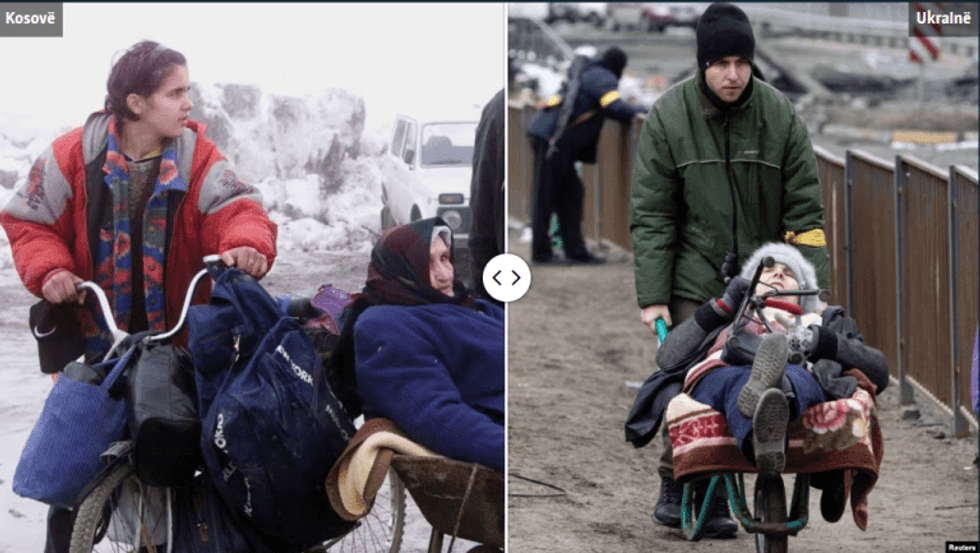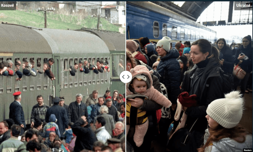 Këto fotografi të luftës në Kosovë dhe në Ukrainë janë shkrepur me mbi 20 vjet diferencë, por kanë një ngjashmëri të frikshme, dhe shërbejnë si kujtesë se lufta ka po të njëjtën fytyrë kudo, ajo sjell vuajtje të pafundme njerëzore dhe shkatërrim të madh.