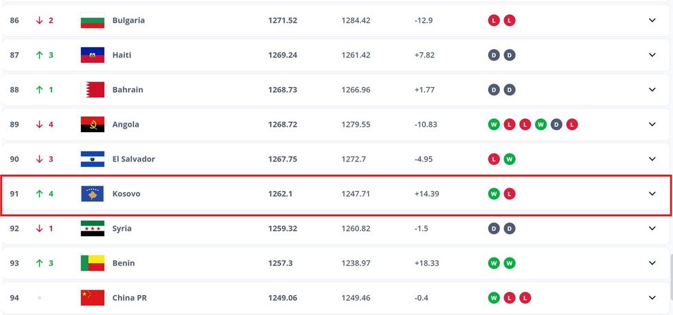 Kësisoj Kosova nga pozita e 95-të tani ndodhet në të 91-të, pozita më e lartë në histori të Dardanëve që nga viti 2016.