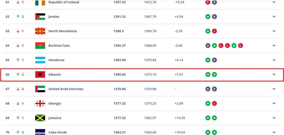 Ngritje ka pësuar edhe Kombëtarja e Shqipërisë pas fitoreve në muajin shtator ndaj Gjibraltarit dhe Letonisë nga 1-0.