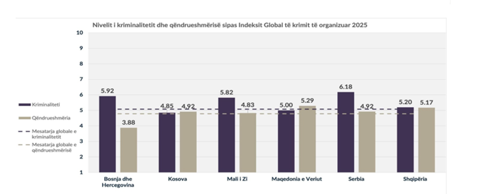 Sipas rezultateve të këtij indeksi për vitin 2025, i cili mat 15 tregje kriminale, 5 lloje akterësh kriminalë dhe 12 blloqe të qëndrueshmërisë, të publikuar nga Global Initiative Against Transnational Organized Crime, Kosova vlerësohet me nivelin më të ulët të kriminalitetit në Ballkanin Perëndimor, me një mesatare prej 4.85 pikësh në një shkallë vlerësimi nga 1 deri në 10.