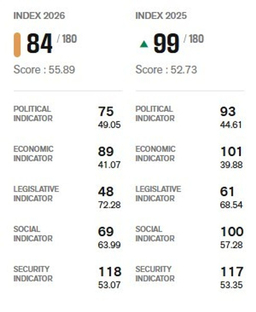 Sipas raportit të publikuar këtë të enjte, Kosova renditet në vendin e 84-të në botë, me 55.89 pikë, 3 më shumë se një vit më parë.
