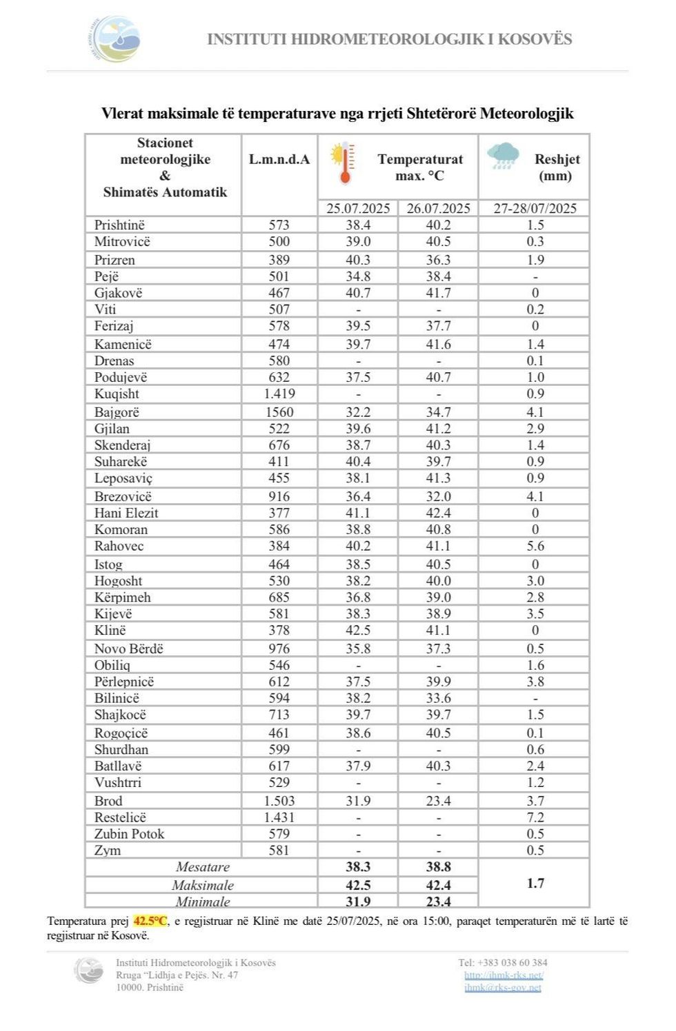 Sipas këtyre të dhënave, temperatura më e lartë u regjistrua në Klinë më 25 korrik, në orën 15:00, dhe sipas institutit kjo paraqet temperaturën më të lartë të regjistruar ndonjëherë në Kosovë, transmeton Telegrafi.