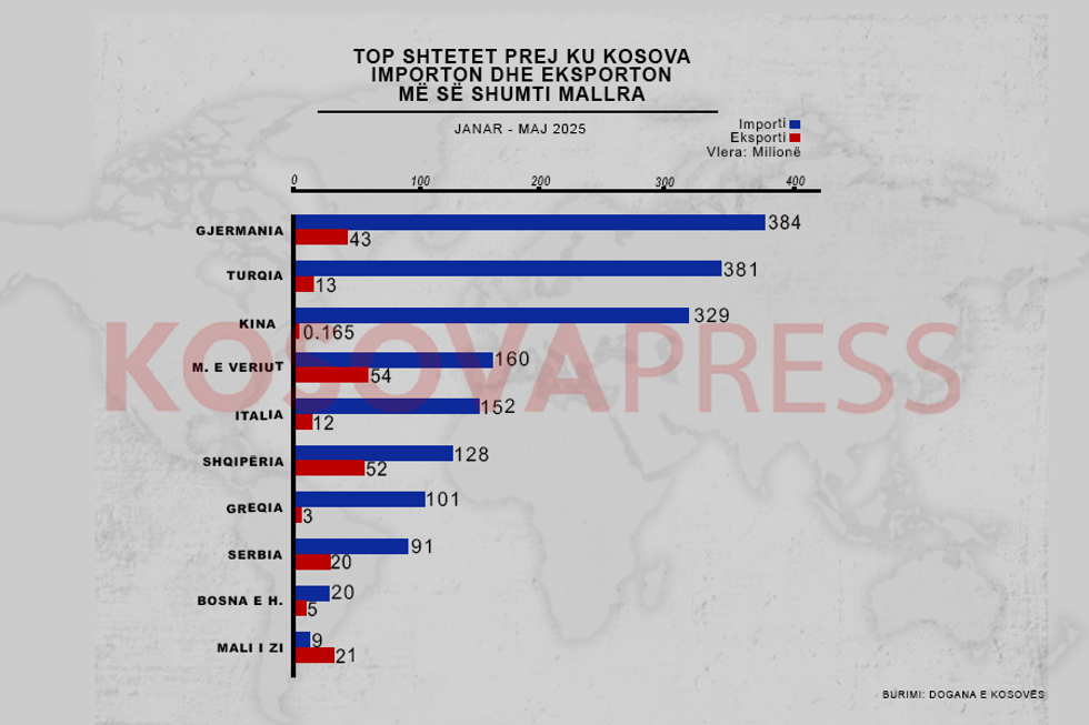 Krahas kësaj, top tri shtetet e para që Kosova pranoi importe në muajt janar-maj të vitit 2025 janë Gjermania me rreth 384 milionë euro, Turqia me 381 milionë euro, pasuar nga Kina me mbi 329 milionë euro. Pas këtyre, tri shtetet e tjera që sjellin mallra në Kosovë janë Shqipëria, Italia dhe Maqedonia e Veriut.