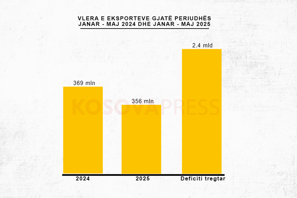Referuar të dhënave të Doganës së Kosovës, në muajt janar-maj 2025, vlera e eksportit nga Kosova është mbi 356 milionë euro, derisa në këtë periudhë të vitit të kaluar ishte rreth 369 milionë euro. Derisa diferenca në këto shifra kalon shifrën prej 12 milionë euro.