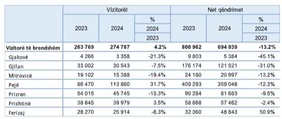 Në aspektin rajonal, Rajoni i Prishtinës ka pasur numrin më të madh të vizitorëve vendorë, me 205.405, ndërsa Rajoni i Pejës ka regjistruar numrin më të lartë të net-qëndrimeve, me 591.673.
