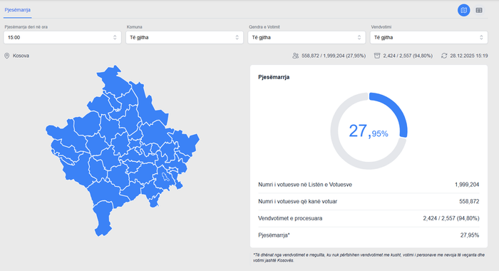 28/12/2025 15:26- KQZ: Deri në ora 15:00 kanë votuar 27.95 për qind e qytetarëve