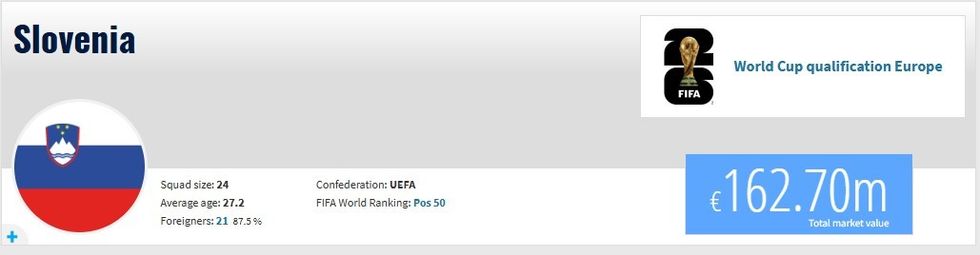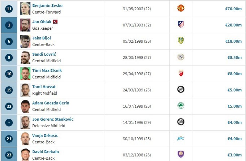 Te Sllovenia, lojtari më i vlefshëm është sulmuesi i Manchester Unitedit, Benjamin Sesko me vlerë 70 milionë euro, teksa pas tij vijnë Jan Oblak me vlerë 20 milionë euro, Jaka Bijol me 18 milionë euro, Sandi Lovrit me 8.5 milionë euro dhe Timi Max Elsnik me vlerë 8 milionë euro. /Telegrafi/