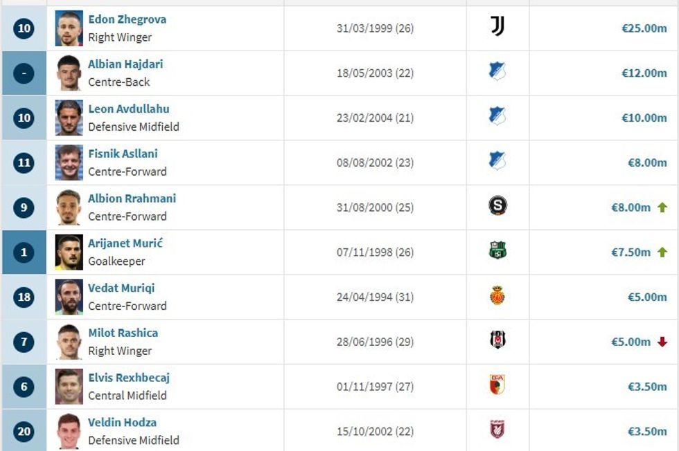 Lojtari më i vlefshëm i Kosovës është ylli i Juventusit, Edon Zhegrova, i cili vlerësohet 25 milionë euro, teksa pas tij vijnë Albian Hajdari me 12 milionë euro, Leon Avdullahu me 10 milionë euro, Fisnik Asllani me tetë milionë euro, po aq sa vlen edhe Albion Rrahmani.
