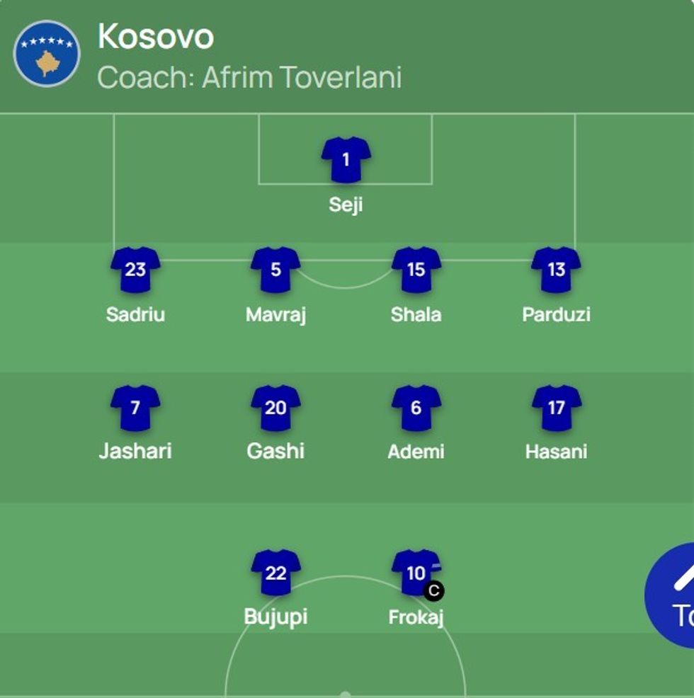 Përzgjedhësi i Kosovës U21, Afrim Tovërlani ka startuar me formacionin 4-4-2 në këtë sfidë, me dyshen Bujupi e Frrokaj që janë në maje të sulmit.