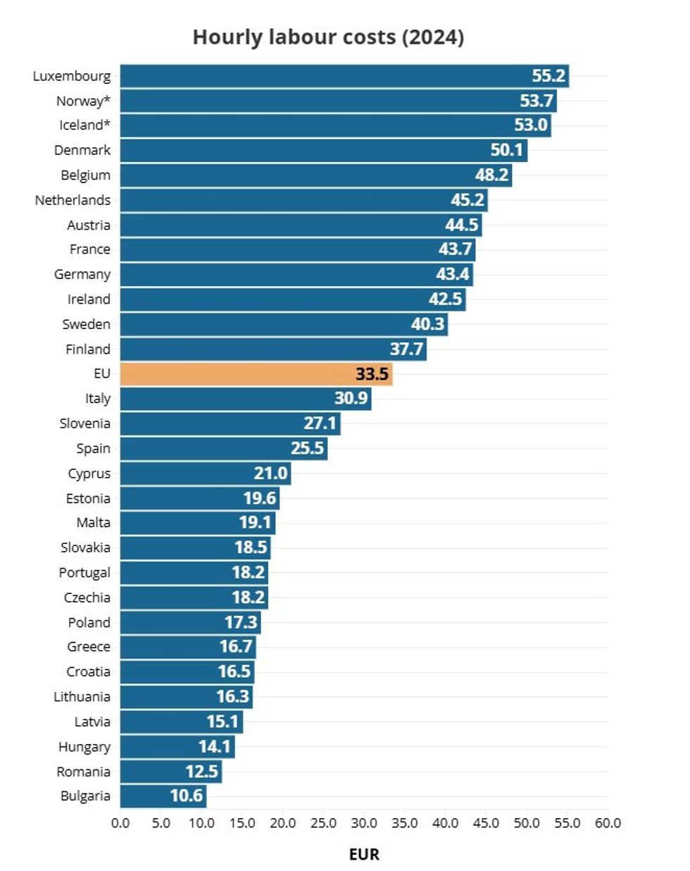 Sipas mediave të huaja, përcjell Telegrafi, në vitin 2024, kostoja e punës për orë varionte nga 10,6 € në Bullgari në 55,2 € në Luksemburg midis vendeve të BE-së sipas Eurostat.