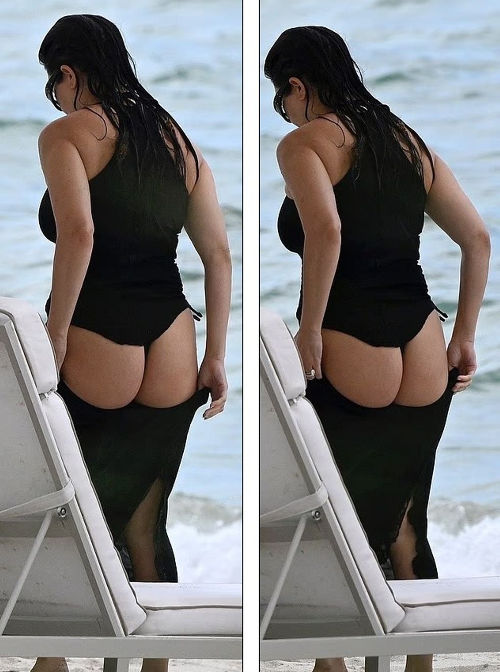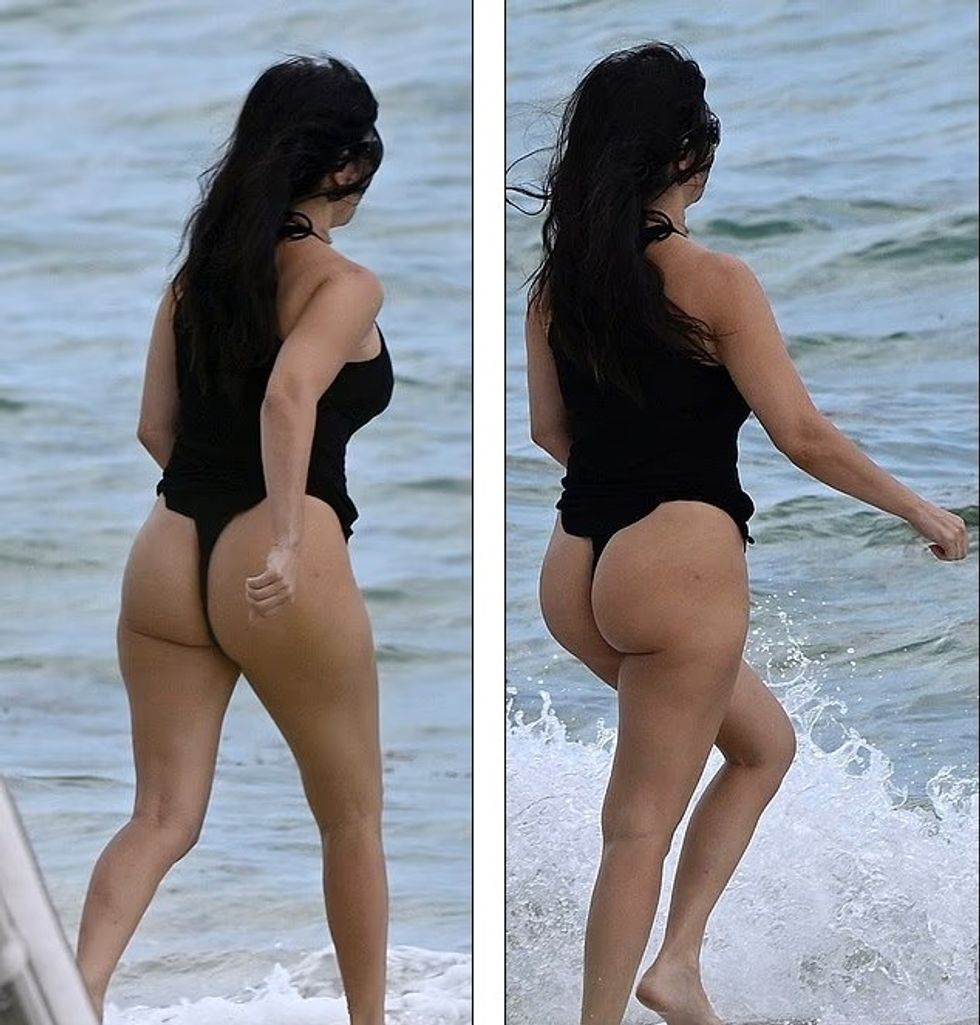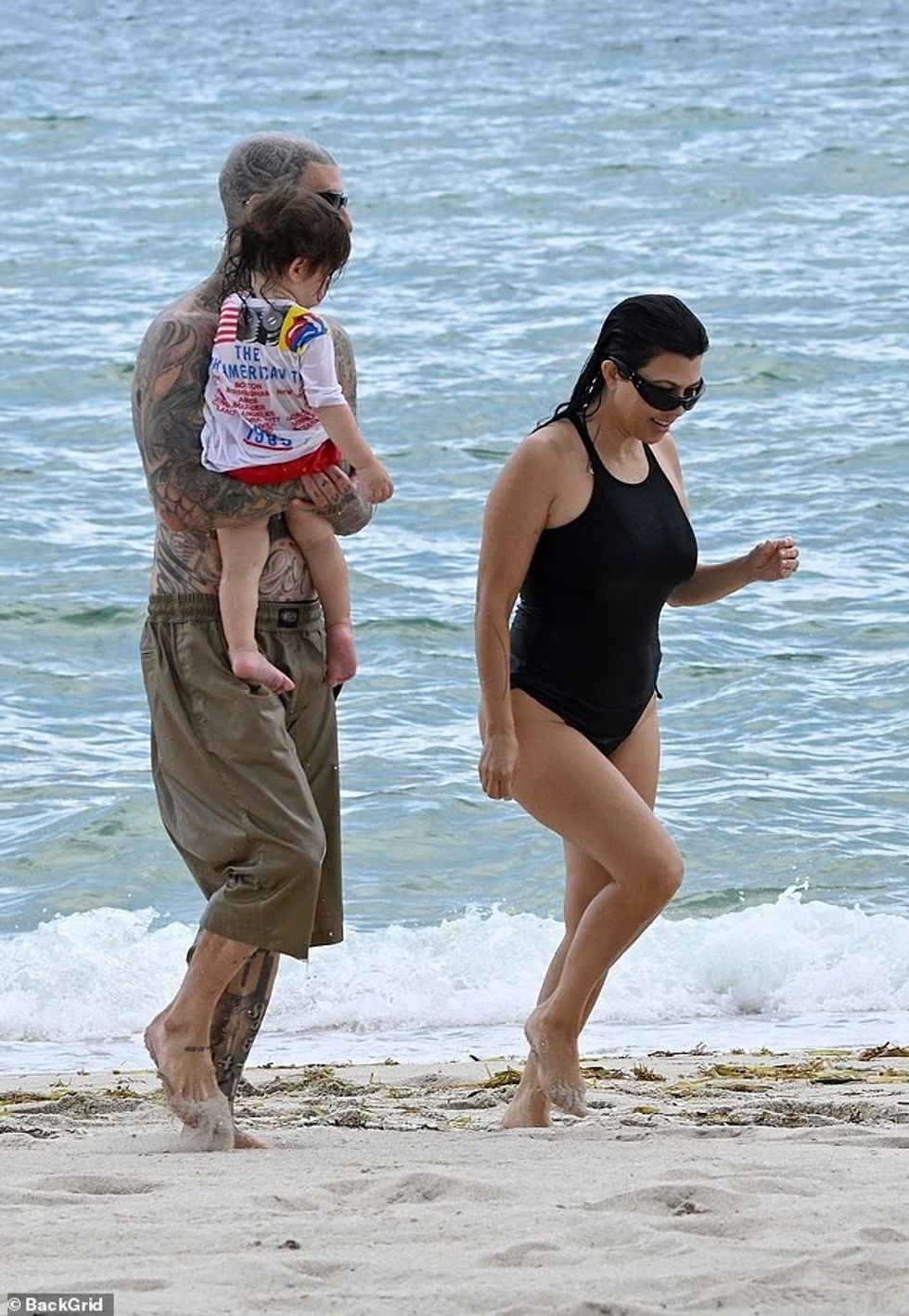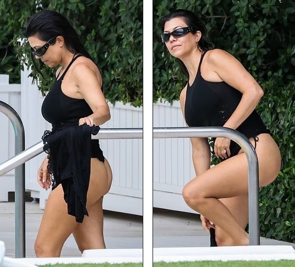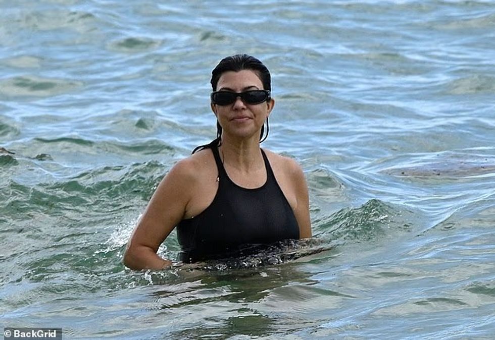 E veshur me një rroba banjo të zezë njëpjesëshe në formë thong, Kourtney u pa duke shijuar detin në plazhin e Miamit të mërkurën, shkruan DailyMail.