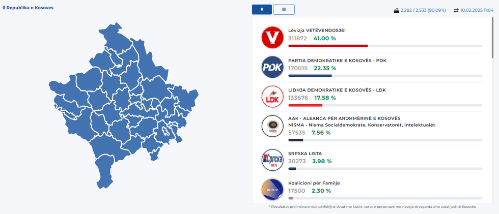 Komisioni Qendror i Zgjedhave ka dal me statistika të reja deri në orën 11:04, ku janë numëruar 90.09 për qind e votave, sipas së cilave, Lëvizja Vetëvendosje prin me 41.00 për qind, pasuar nga Partia Demokratike e Kosovës me 22.35 për qind, Lidhja Demokratike 17.58 për qind, e katërta me radhë është AAK-Nisma me 7.56 për qind të votave.
