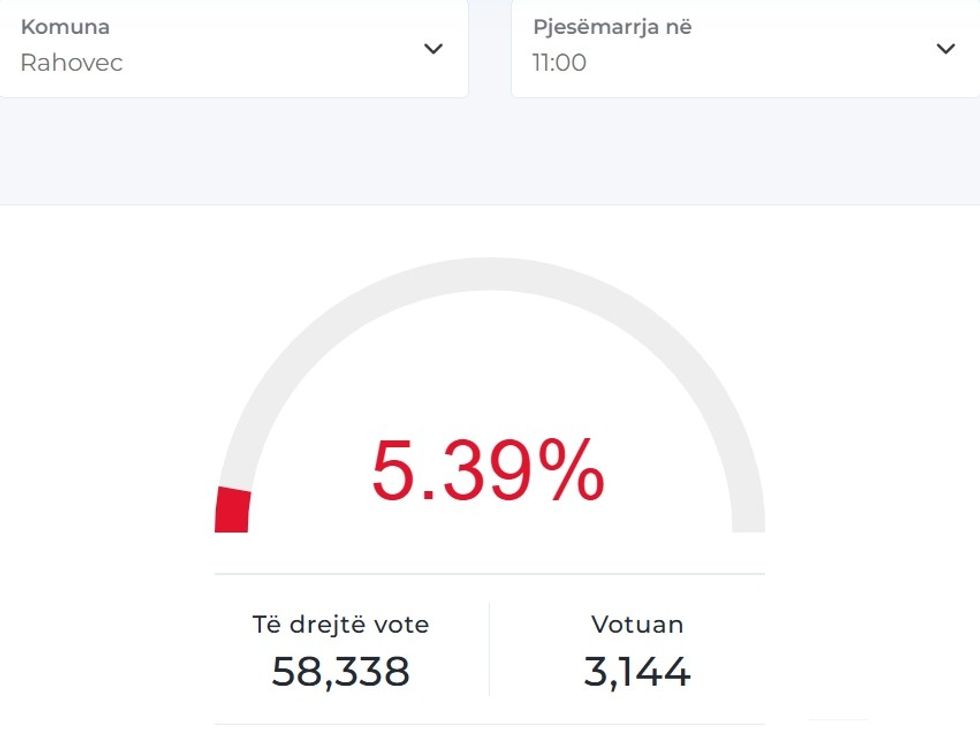Ndërsa në Komunën e Rahovecit, përqindja e votuesve deri në ora 11:00 është 5.39%, ku më saktësisht deri në këtë orë në këtë komunë ku kanë të drejtë vote 58 mijë e 338 qytetarë, kanë votuar vetëm 3144 prej tyre.