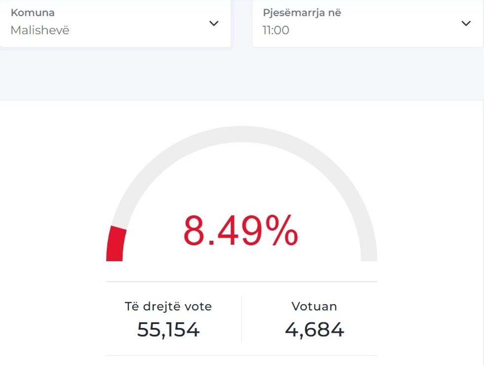 Në Komunën e Malishevës deri në ora 11:00 sipas KQZ-së kanë prej 55 mijë e 154 qytetarëve me të drejtë vote, kanë votuar 4684 prej tyre, ose 8.49%.