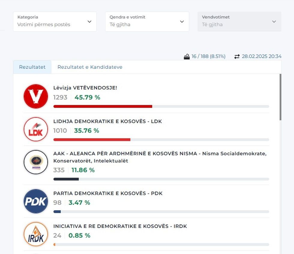 Votat e numëruara janë nga komunat Deçan (5 kuti nga 6), Gjakovë (2 nga 12 kutitë), Novobërdë (1 kuti), Shtërpcë (1 kuti), Zveçan (1 kuti), Mamushë (1 kuti), Hani Elezit (1 kuti), Graçanicë (1 kuti), Ranillugë (1 kuti), Kllokot (1 kuti), Mitrovicë e Veriut (1 kuti). /Telegrafi/