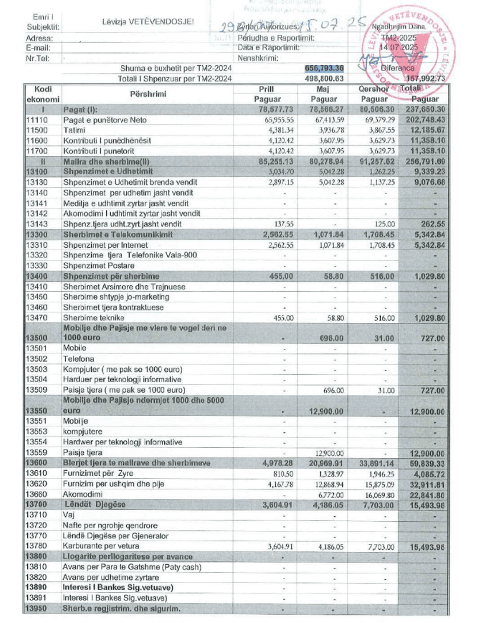 Nga 656,793.36 sa kishin buxhet për tremujorin e dytë të vitit 2025, LVV ka shpenzuar 498,800.63, transmeton Telegrafi.