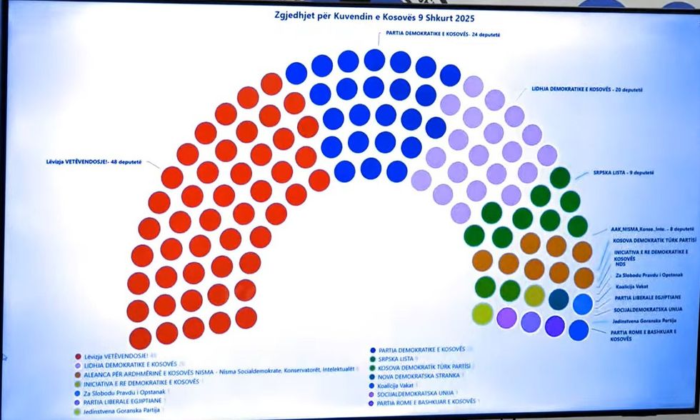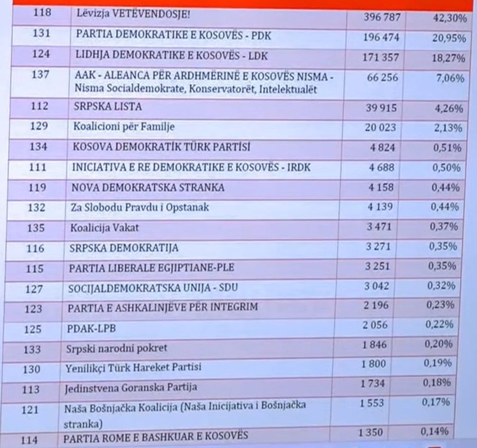 Me këto përqindje, LVV-ja i ka siguruar 48 ulëse në Kuvendin e Kosovës, PDK-ja 24 sosh, LDK - 20 vende, Lista Serbe nëntë vende dhe koalicioni AAK-Nisma, tetë vende.