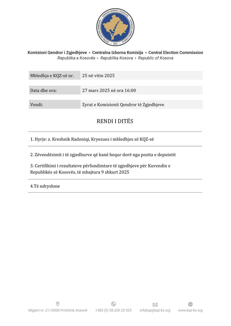 Sipas njoftimit, KQZ ka këto pika të rendit të ditës: zëvendësimin e të zgjedhurve që kanë hequr dorë nga pozita e deputetit dhe certifikimin e rezultateve përfundimtare të zgjedhjeve për Kuvendin e Kosovës, të mbajtura më 9 shkurt 2025.