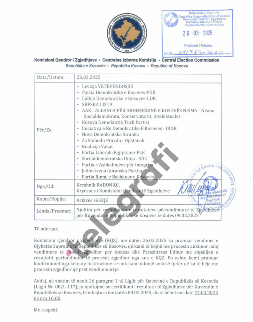 “Komisioni Qendror i Zgjedhjeve (KQZ), më datën 26.03.2025, ka pranuar vendimet e Gjykatës Supreme të Republikës së Kosovës, që kanë të bëjnë me procesin ankimor ndaj vendimeve të Panelit Zgjedhor për Ankesa dhe Parashtresa lidhur me shpalljen e rezultatit përfundimtar të procesit zgjedhor nga ana e KQZ-së. Po ashtu kemi pranuar konfirmimet nga këto dy institucione se nuk kanë ndonjë ankesë tjetër që ka të bëjë me procesin zgjedhor që pret vendimmarrje. Andaj, në zbatim të nenit 26 paragrafi 1 të Ligjit për Qeverinë e Republikës së Kosovës (Ligji Nr.08/L.117), ju njoftojmë se certifikimi i rezultatit të Zgjedhjeve për Kuvendin e Republikës së Kosovës, të mbajtura më datën 09.02.2025, do të bëhet më datën 27.03 .2025 në ora 16:00”, thuhet në letër.