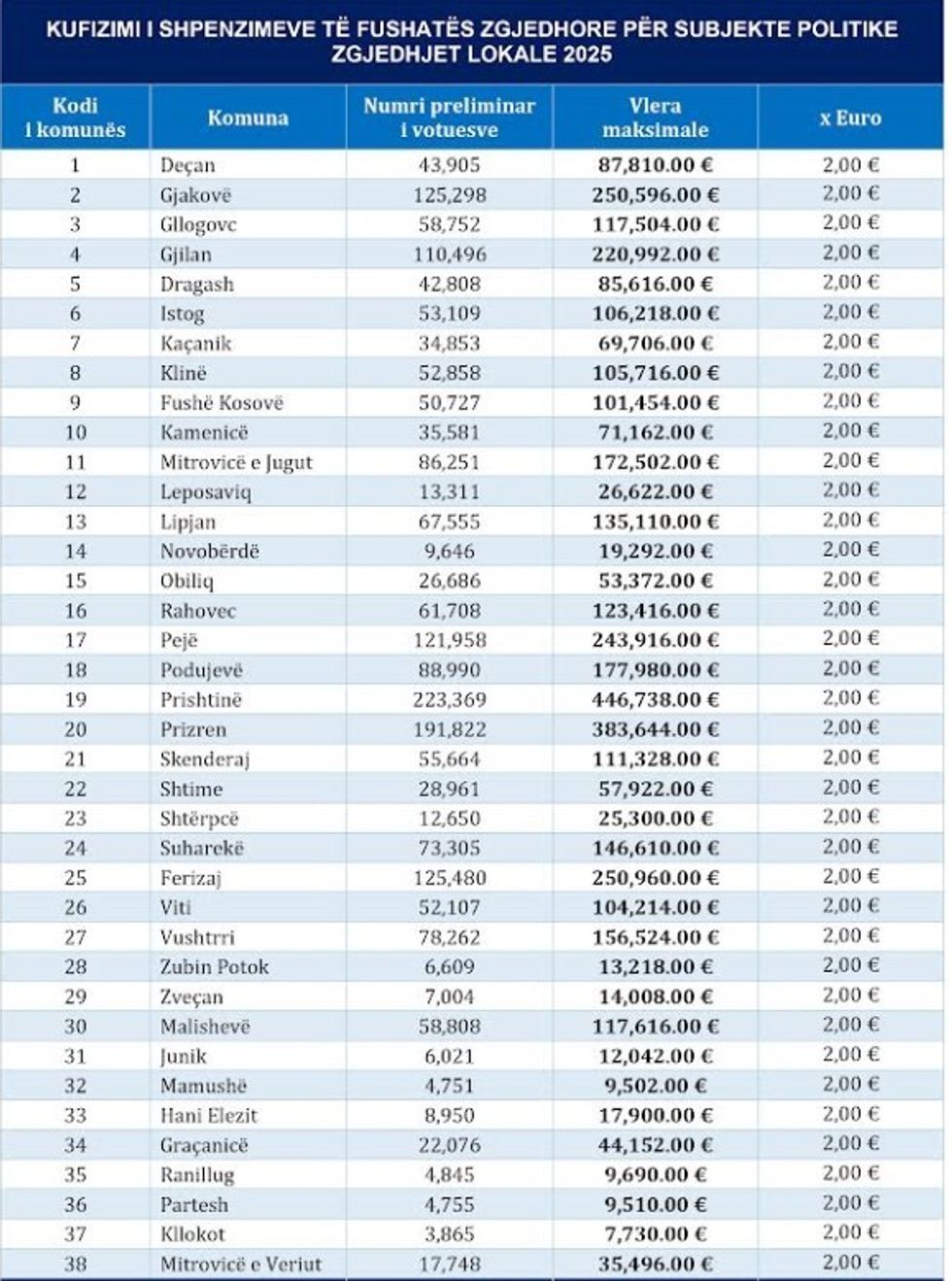Kjo llogaritje është bërë duke u mbështetur në Rregulloren Zgjedhore nr. 07/2024 për fushatën e zgjedhjeve, monitorimin e fushatës së zgjedhjeve si dhe duke u mbështetur në të dhënat e listës preliminare të votuesve në secilën komunë, sipas të cilës numri i përgjithshëm i votuesve në vendin tonë është 2,071,544 votues.