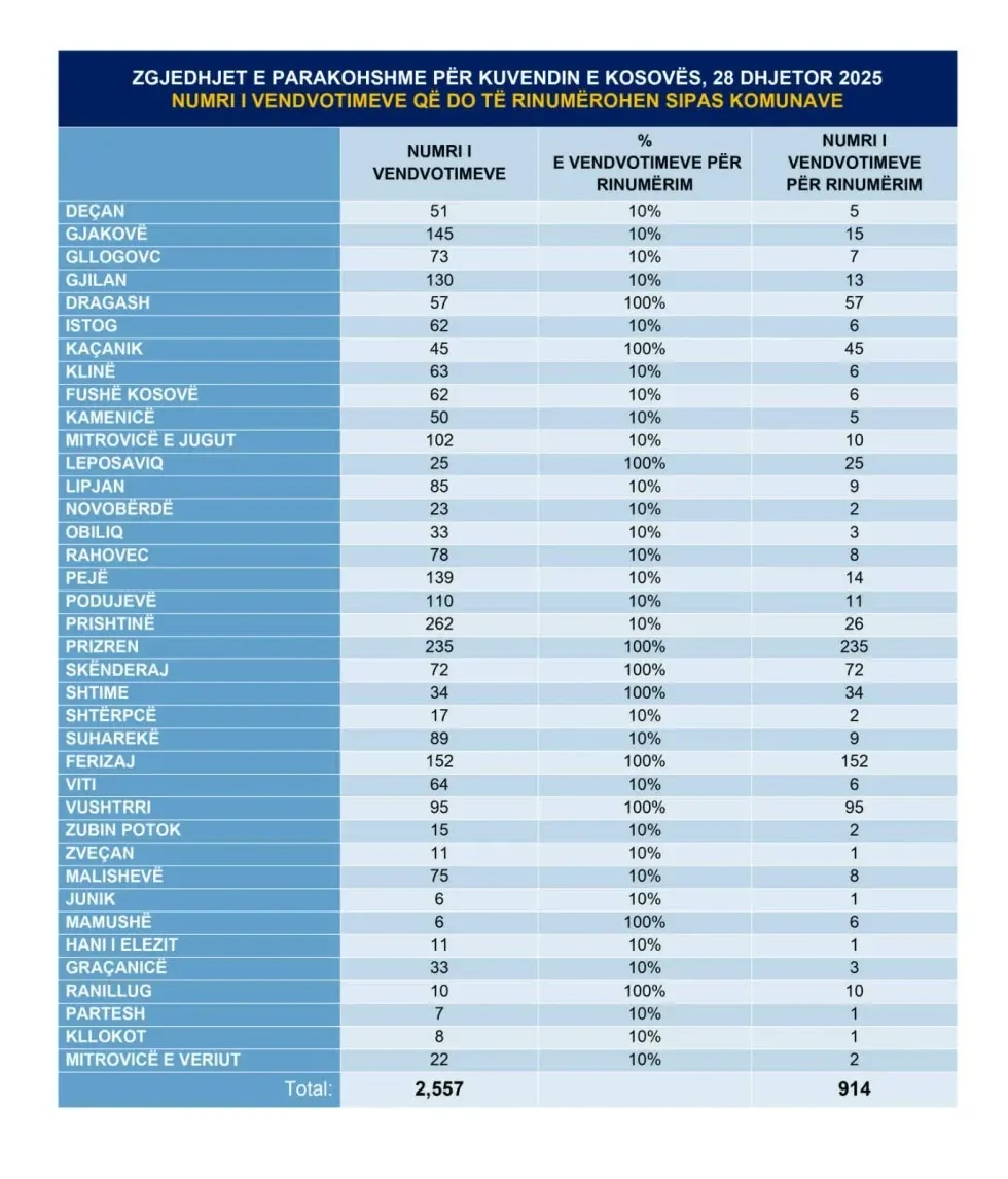 Në 10 komuna rinumërimi do të bëhet në tërësi, ndërsa në 28 komuna të tjera do të rinumërohen vetëm 10 për qind e vendvotimeve.