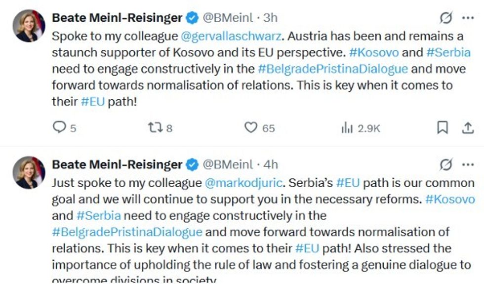 Ministrja e Jashtme e Austrisë, Beate Meinl-Reisinger, ka bërë thirrje që Kosova dhe Serbia të angazhohen në mënyrë konstruktive në dialogun Kosovë - Serbi dhe të ecin përpara me normalizimin e marrëdhënieve.