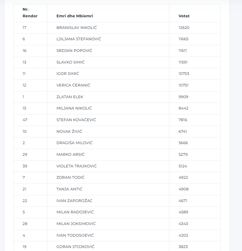 Shikoni më poshtë votat e kandidatëve për deputetë nga Lista Serbe: