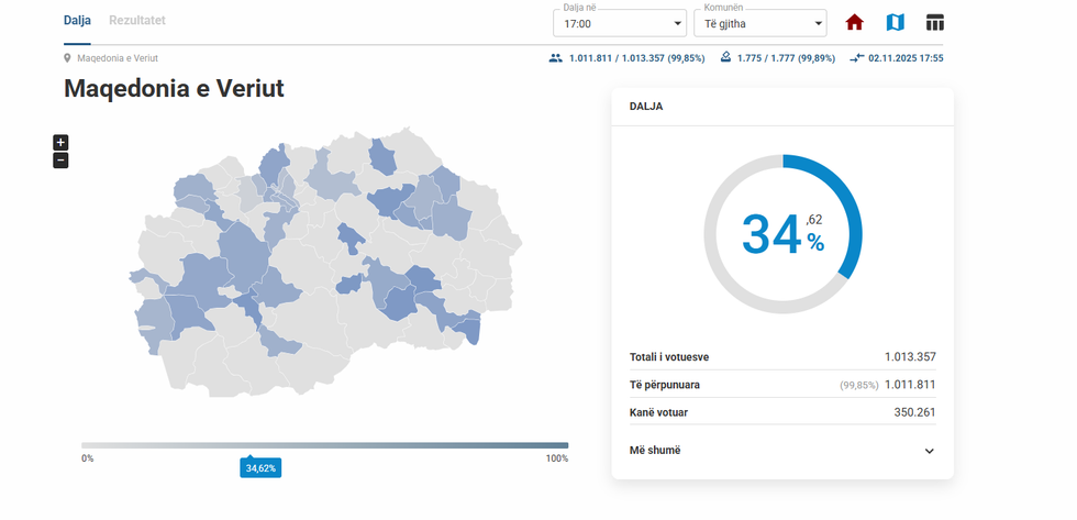 Nga KSHZ thonë se deri në ora 17:00 kanë votuar 34,62 % e qytetarëve me të drejtë vote, teksa një rritje e dukshme vërehet në Bërvenicë dhe Kërçovë.
