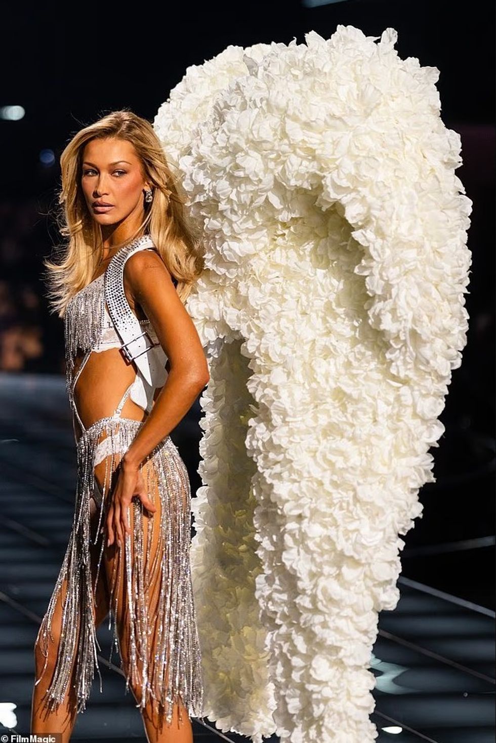 Një video virale në TikTok e tregon Hadid, e veshur me një palë krahë 22 kilogramësh, teksa përpiqet të ruajë ekuilibrin dhe ritmin në skenë.