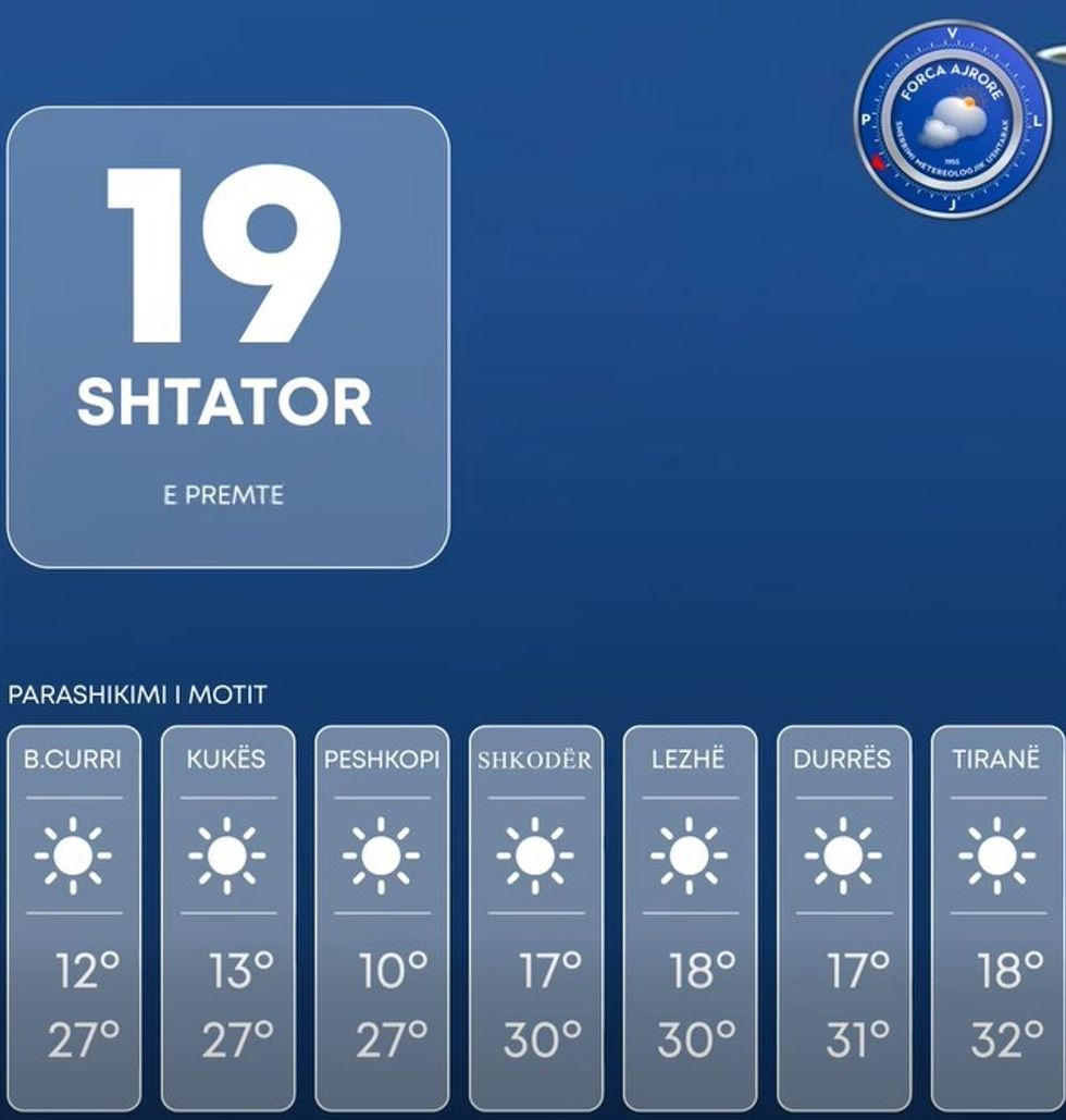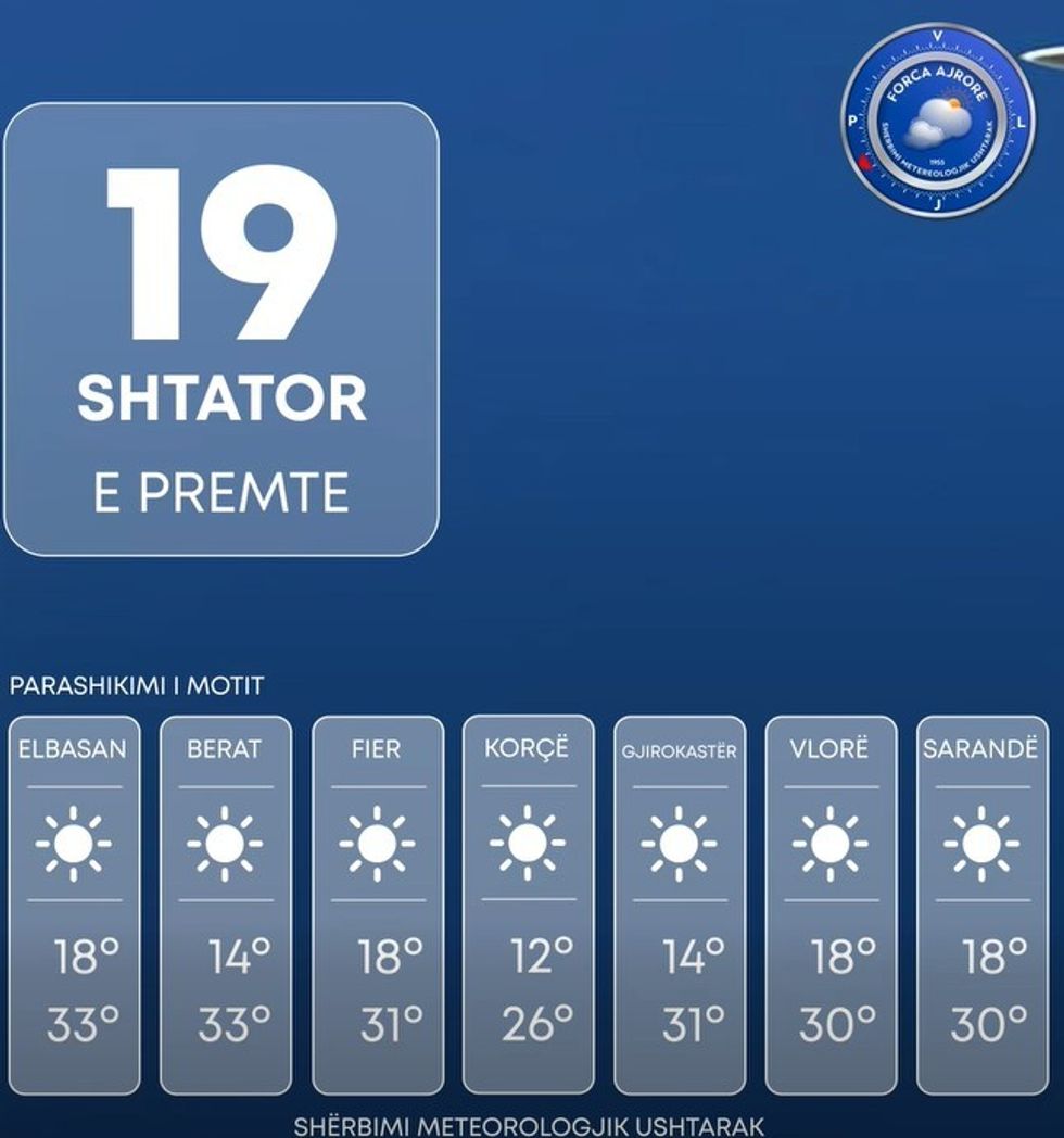 Shërbimi Meteorologjik Ushtarak bën të ditur se moti parashikohet të jetë i kthjellët në të gjithë territorin.