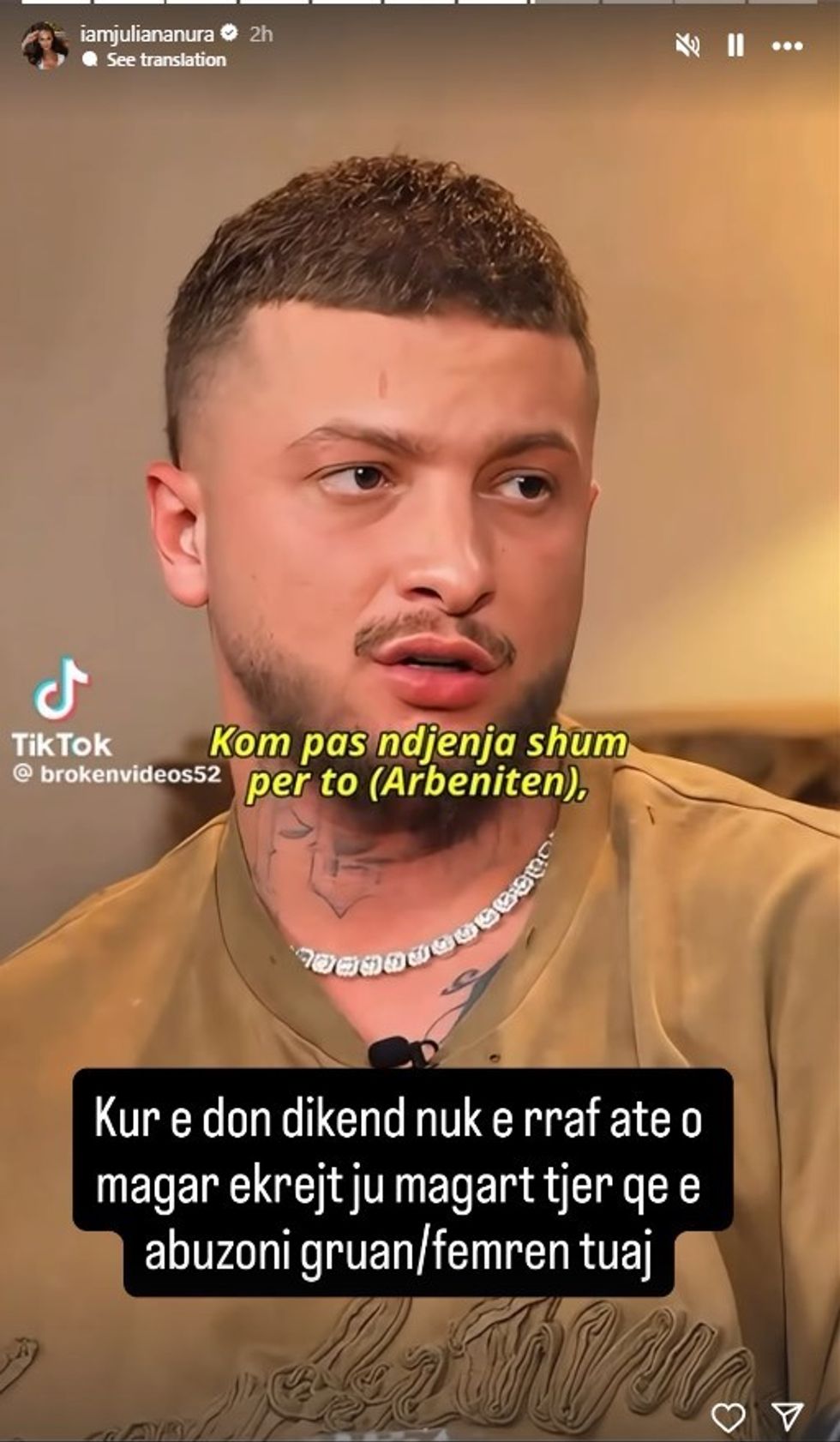 Pak pas publikimit të intervistës, Juliana Nura reagoi ashpër nëpërmjet një postimi në Instastory, ku shprehu zero tolerancë ndaj dhunës ndaj grave.