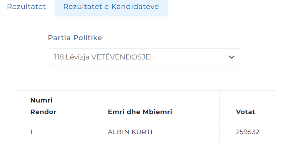 Kurti ka marrë deri më tani 259 mijë e 532 vota. Pas tij më i votuar është kandidati i PDK-së për kryeministër, Bedri Hamza me 150 mijë e 294 vota.