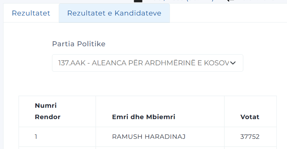 Kandidati i LDK-së për kryeministër, Lumir Abdixhiku është i treti me 109 mijë e 202 vota dhe i katërti Ramush Haradinaj nga AAK me 37 mijë 752.