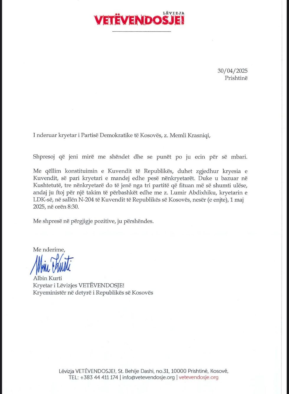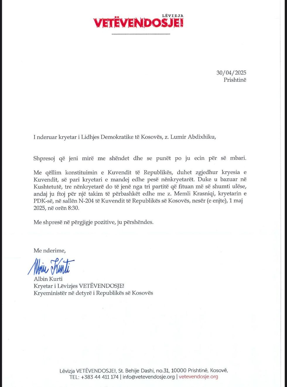 Kryeministri në detyrë i Republikës së Kosovës dhe njëherësh kryetar i Lëvizjes Vetëvendosje, Albin Kurti, i ka dërguar një letër zyrtare kryetarit të Lidhjes Demokratike të Kosovës (LDK), Lumir Abdixhiku, përmes së cilës e fton në një takim konsultativ me qëllim të konstituimit të Kuvendit të ri.
