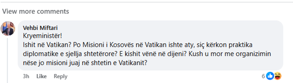 Pas këtij aktiviteti, Vehbi Miftari, Shefi i Misionit të Posaçëm të Republikës së Kosovës në Vatikan, ka reaguar duke pyetur kryeministrin për mënyrën e organizimit të vizitës.