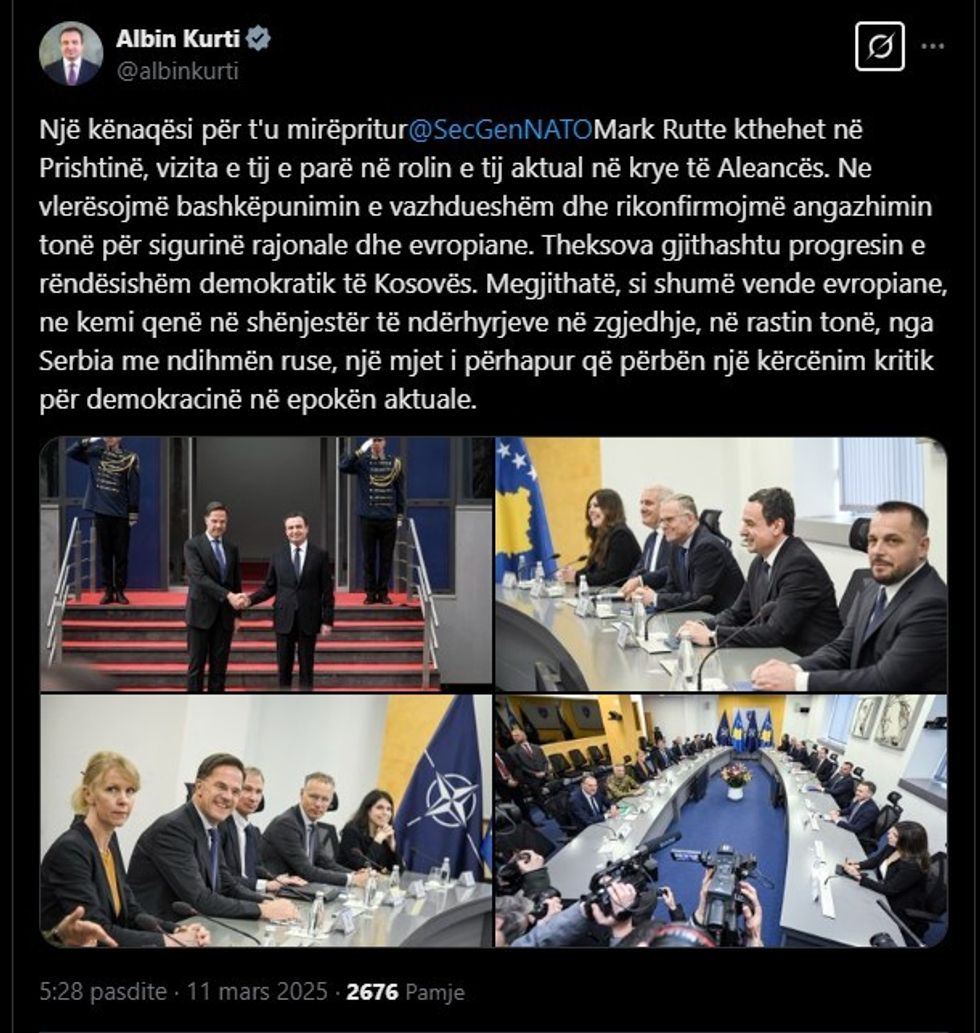 Kurti në platformën sociale X, ka thënë se takimi u përqendrua në bashkëpunimin e vazhdueshëm mes Kosovës dhe NATO-s, si dhe në angazhimin e përbashkët për sigurinë rajonale dhe evropiane.