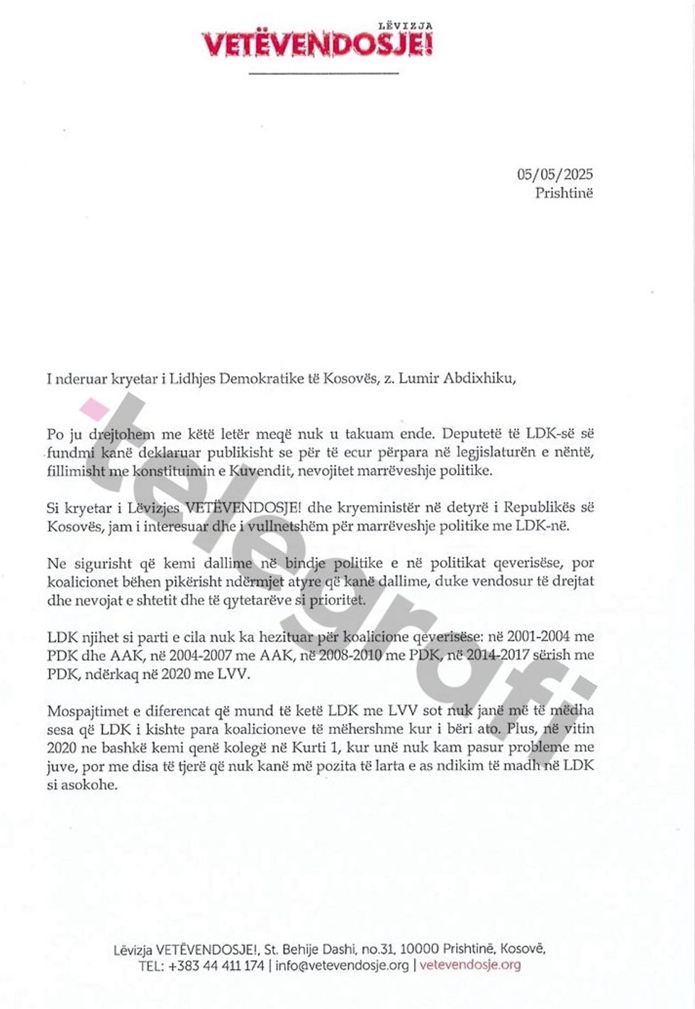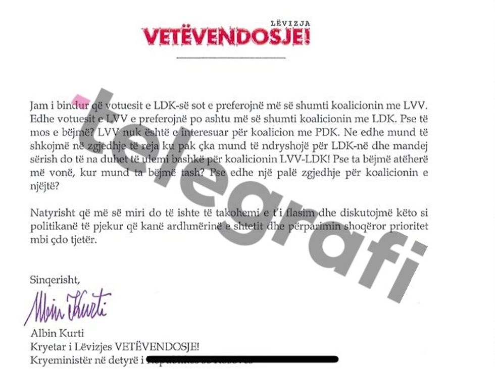 Në letrën e tij, Kurti thekson se votuesit e të dyja partive, LVV dhe LDK, sot do të preferonin më së shumti një koalicion të përbashkët, duke shprehur gatishmërinë për të bashkëpunuar në interes të vendit dhe të qytetarëve.