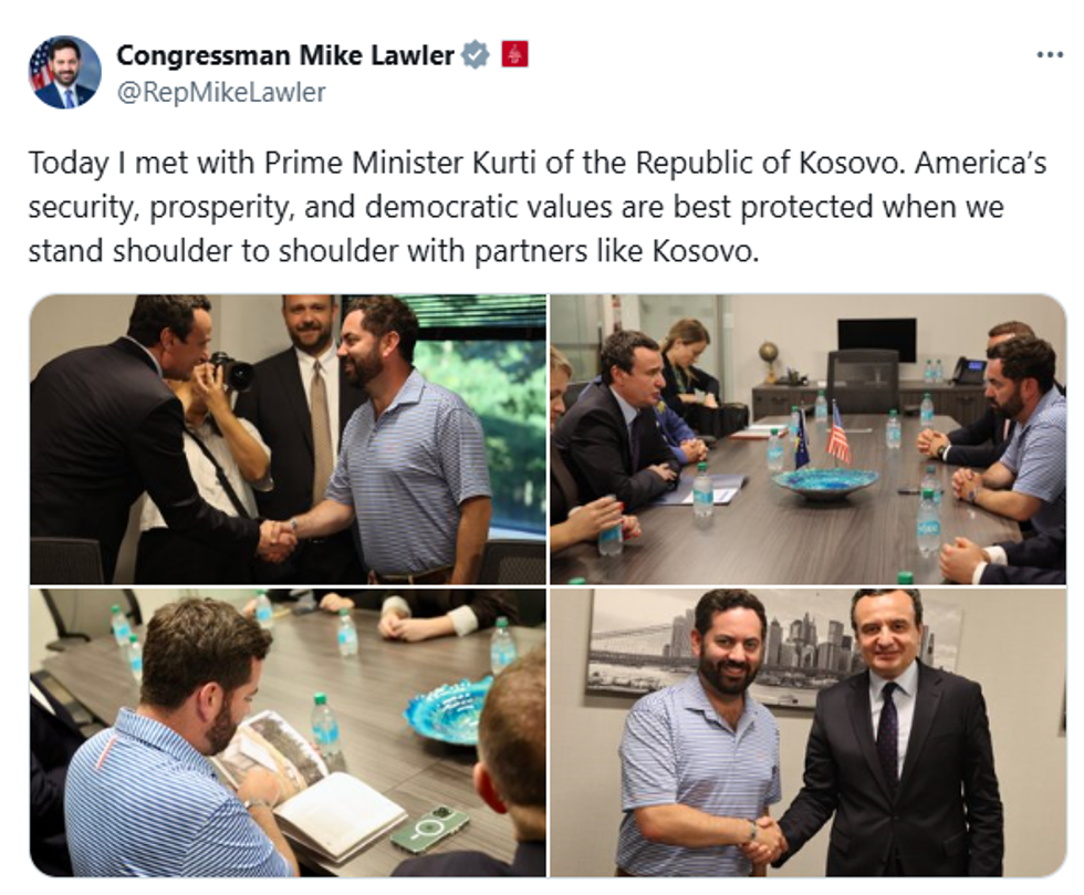 Në New York të Shteteve të Bashkuara të Amerikës, kryeministri në detyrë i Republikës së Kosovës, Albin Kurti, takoi kongresistin amerikan nga radhët e Partisë Republikane, Mike Lawler, njëherësh anëtar i Komitetit për Punë të Jashtme në Dhomën e Përfaqësuesve të Shteteve të Bashkuara të Amerikës.
