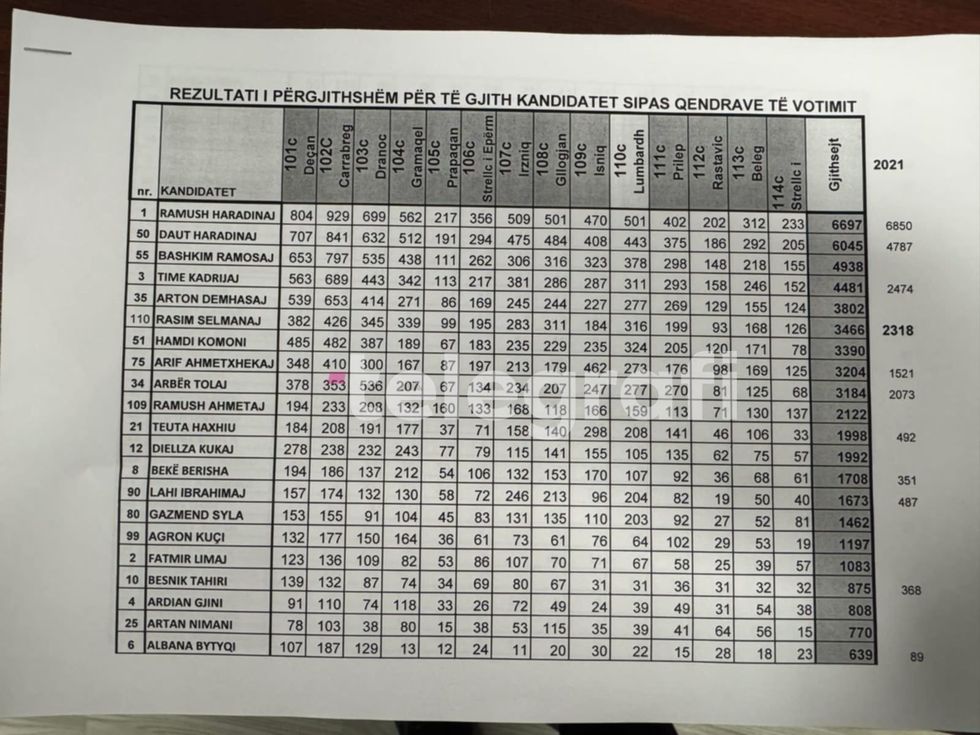 Sipas listës që ka siguruar Telegrafi, Ramush Haradinaj në Deçan ka marrë 6,697 vota, Daut Haradinaj ka 6,045, Fatmir Limaj ka marrë 1,083 vota, Time Kadrijaj 4,481 vota, Arber Tolaj 3,184, Albana Bytyqi 639 vota, Ardian Gjini 808 vota, Bashkim Ramosaj 4,938 vota.